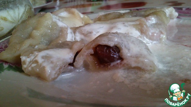 Сверху племянница полила вареники сметаной и немного посыпала сахаром ( безумная сладкоежка))