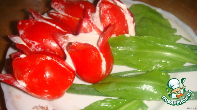 Помидоры наполнить фаршем и выложить на тарелку, стебли можно сделать из зелёного лука, а листья из щавеля.