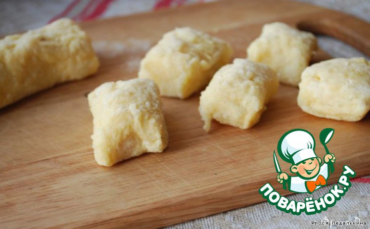 Разделить тесто на несколько частей и скатать колбаски толщиной 2 см. Порезать на небольшие кусочки.