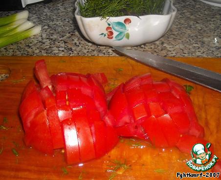 Помидор нарезаем мелкими кубиками вместе со шкуркой