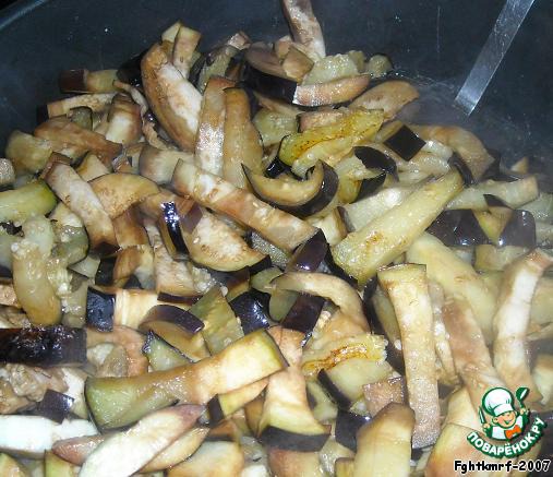 Баклажаны нарезаем соломкой (не вымачиваем) и обжариваем на хорошо разогретом подсолнечном масле до хорошо прожаренной корочки (лучше жарить сразу в форме, в которой вы будете запекать «кугель»).
