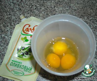 Готовим смесь из 5 яиц, 2 ложек муки и ложки майонеза: смесь необходимо хорошо размешать (чтобы была без комочков), лучше делать это в небольшой чашке миксером на невысокой скорости