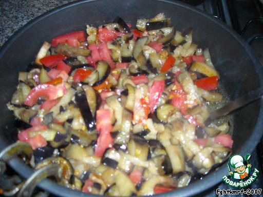 Добавляем к обжаренным баклажанам, и жарим еще 5-6 минут (выпариваем сок помидоры)
