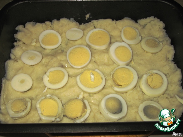 Пюре картофельное распределить по дну формы, сверху выложить кружочки варёного яйца. В следующий раз варёных яиц положу побольше, 5 штучек! Яйца пропитываются сметанкой и становятся очень сочными и вкусными.