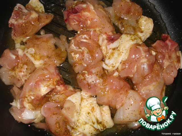 Окорочок помыть, разрезать на кусочки, натереть специями для курицы.