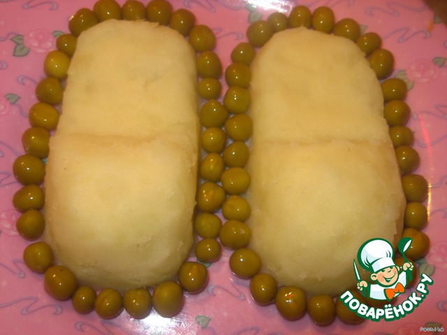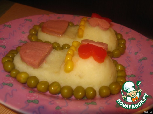На плоскую тарелку кладём две небольшие "кучки" картофельного пюре и с помощью ложки формируем "тапочки".
