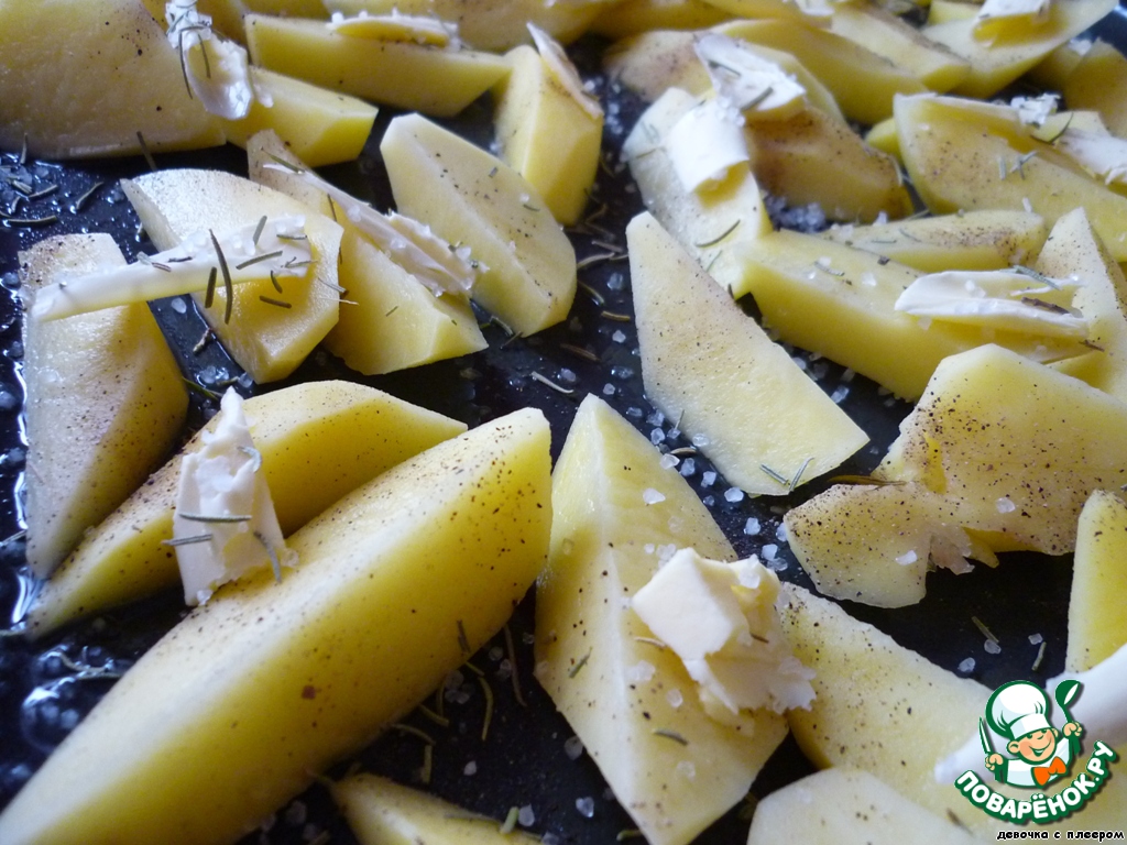 Картофель почистить и нарезать не очень мелкими дольками. Разложить картофель на противне, смазанном 1 ст.л. оливкового масла, выложить на картофель хлопья сливочного масла, поперчить, посыпать розмарином и крупной солью по вкусу. Запекать в разогретой до 225 градусов духовке 20 минут.