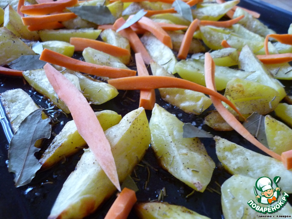 Морковь почистить и нарезать крупной соломкой. Добавить морковь к картофелю вместе с лавровым листом. Запекать еще 25 минут, периодически помешивая.