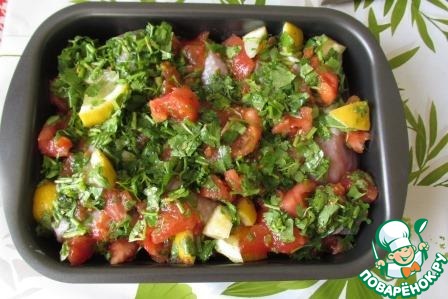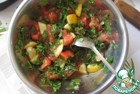 В миске смешиваем кинзу, помидоры, лимон, вливаем лимонный сок и оливковое масло, всыпаем соль и перец.
