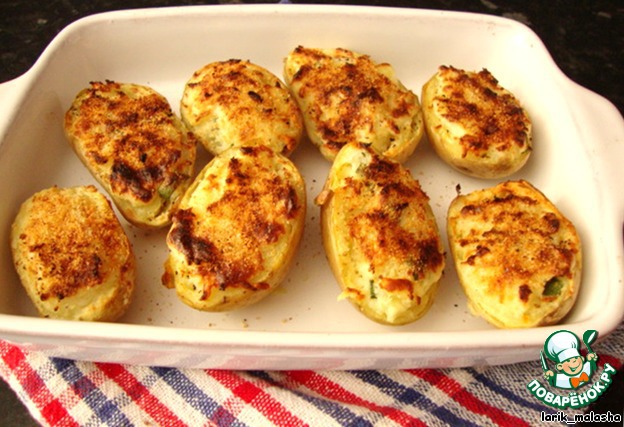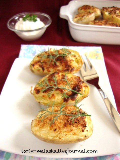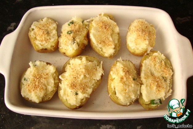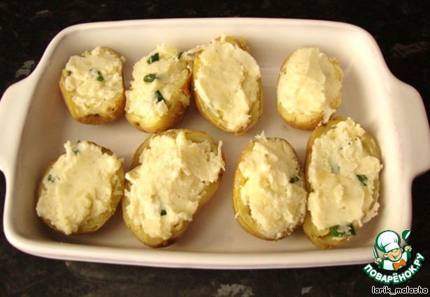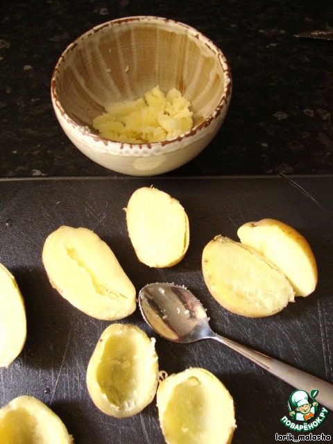 Картофель разрезать вдоль на 2 половины, чайной ложкой аккуратно вынуть мякость, оставляя при этом края. Получается что-то вроде лодочки. Мякоть складываем в тарелку.