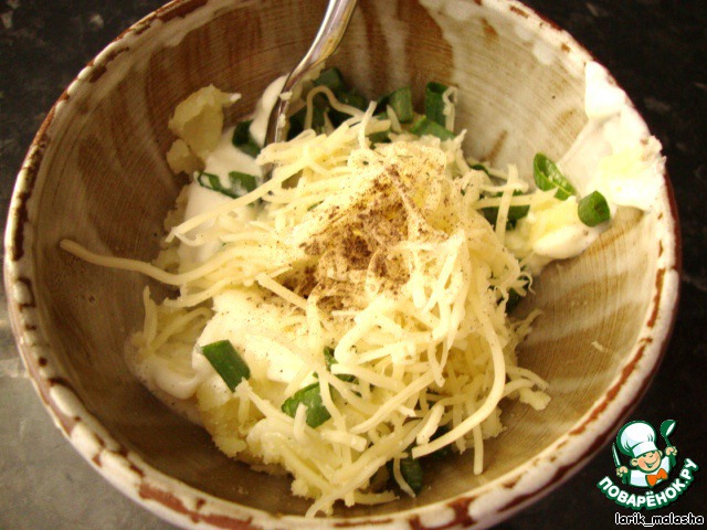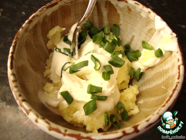Мякоть картошки размять вилкой, добавить сметану, нарезанный зеленый лук.