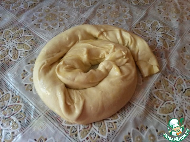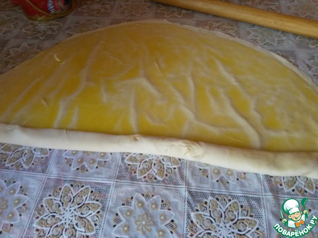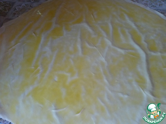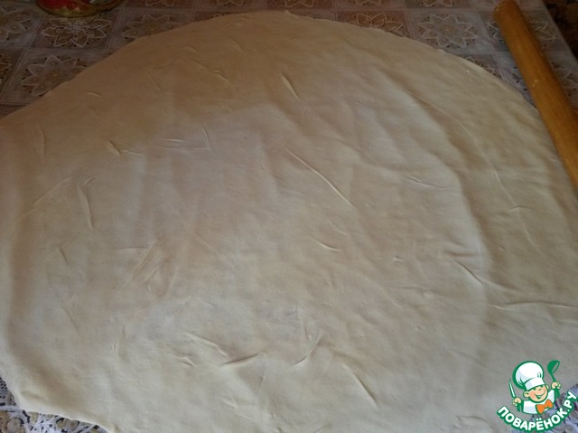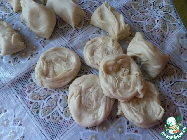 Раскатать скалкой, можно и руками немного растинуть-на готовые лепёшечки выложить ложкой начинку.