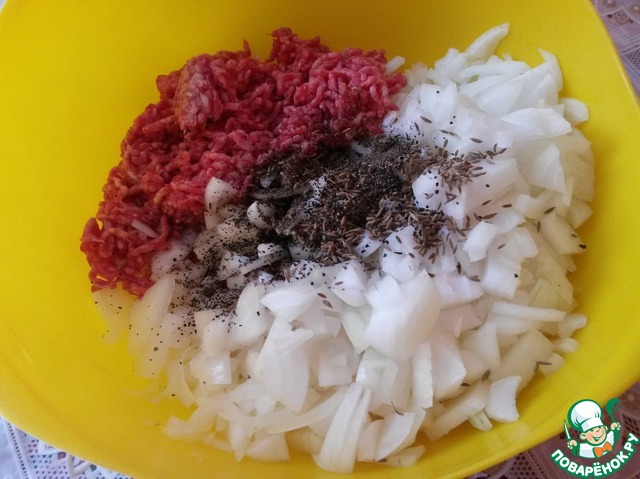 Солим перчим добавляем зиру, и перемешиваем. Начинка готова.