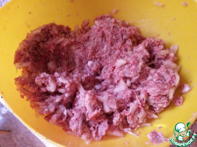 Тесто делаем как на пельмени. Нарезаем лук кубиками, чем лука больше тем лучше (получается сочным)Если есть курдюк баранины-нарезаем мелко (у меня его нет)добавляем всё к фаршу.
