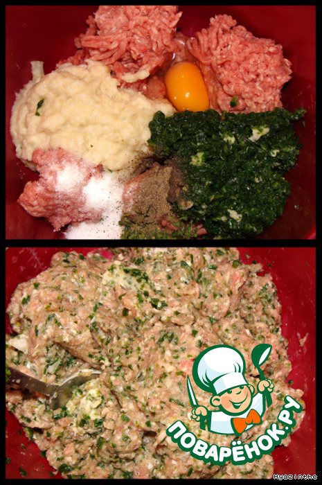 смешать с фаршем, яйцами, шпинатом. Посолить и поперчить по вкусу.