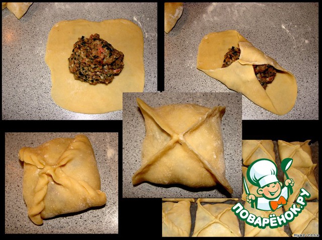 собираем 4 уголка над фаршем и от середины крестообразно защипываем тесто над фаршем (простая защипка или фигурная).