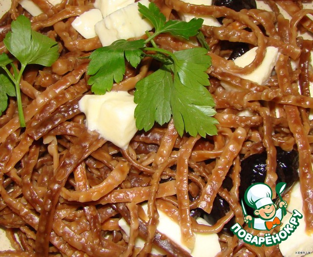 Ну, а дальше на вкус каждого... я нарезала кубиками сыр моцарелла.. Черные оливки... очень вкусно нарезать свежий помидор кубиками.. (но у меня не оказалось).. Посыпать зеленью..))) И можно кушать как самостоятельное блюдо)
