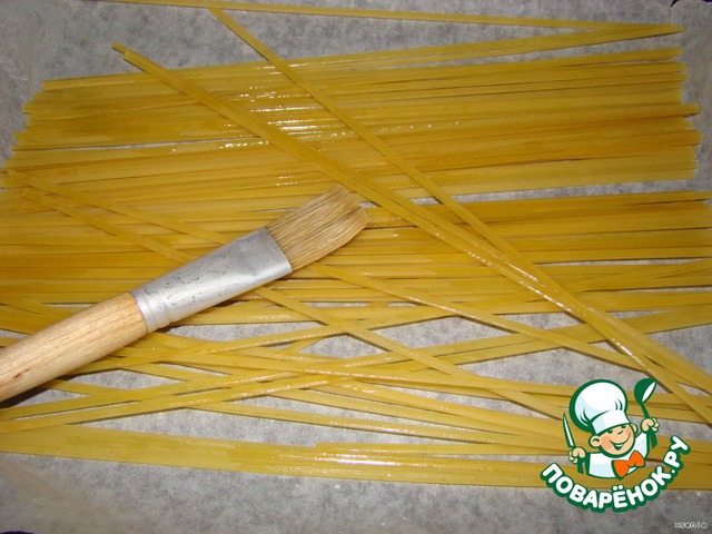 Я покажу, как сделать макаронные изделия... а с чем их есть, ваш выбор)))... Я делала спагетти... Выложила их на противень... буквально немного смазала сливочным маслом (Не обязательно).. и поставила на 5 минут в духовку... Отправила в солярий, так сказать)))