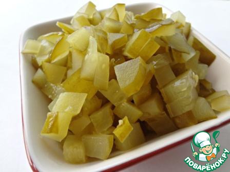 Огурцы порезать кубиками, не очень мелко. Огурца должно быть примерно столько, сколько и сырого мяса. Хотя, можно и меньше, особенно если огурцы пересоленые.