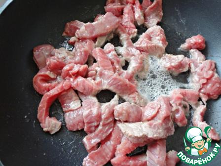 На сковороду налить масло, обжарить на нем мясо минут 5.