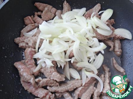 Мясо порезать длинными (3-4см) кусочками толщиной около 1см, лук - полукольцами.