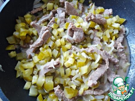 В сковороду к мясу отправляем огурцы и томатную пасту. Доливаем оставшуюся воду. Тушим до готовности мяса. Воды может потребоваться больше. Дополнительно блюдо я не солю, в огурцах достаточно соли, а вот отрегулировать вкус можно сахаром (в общем-то, это известно и без меня))) Я добавляю обычно десертную ложку.