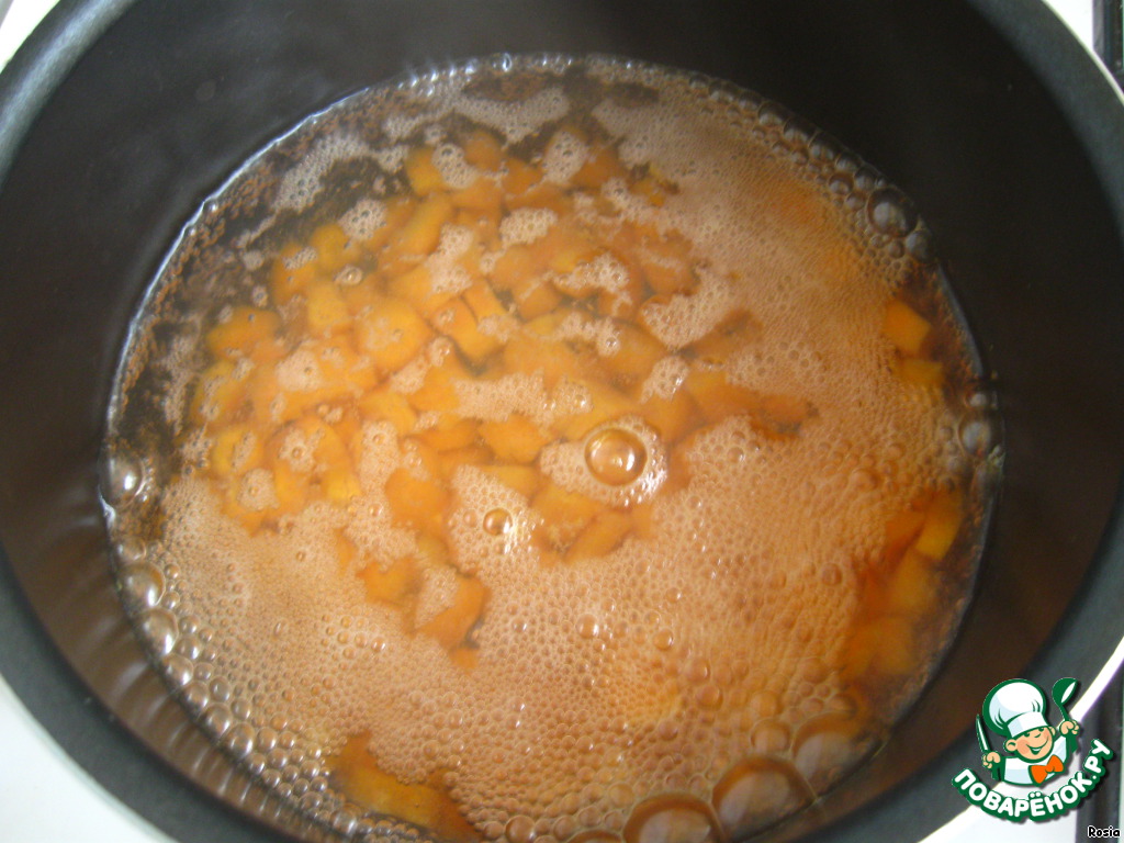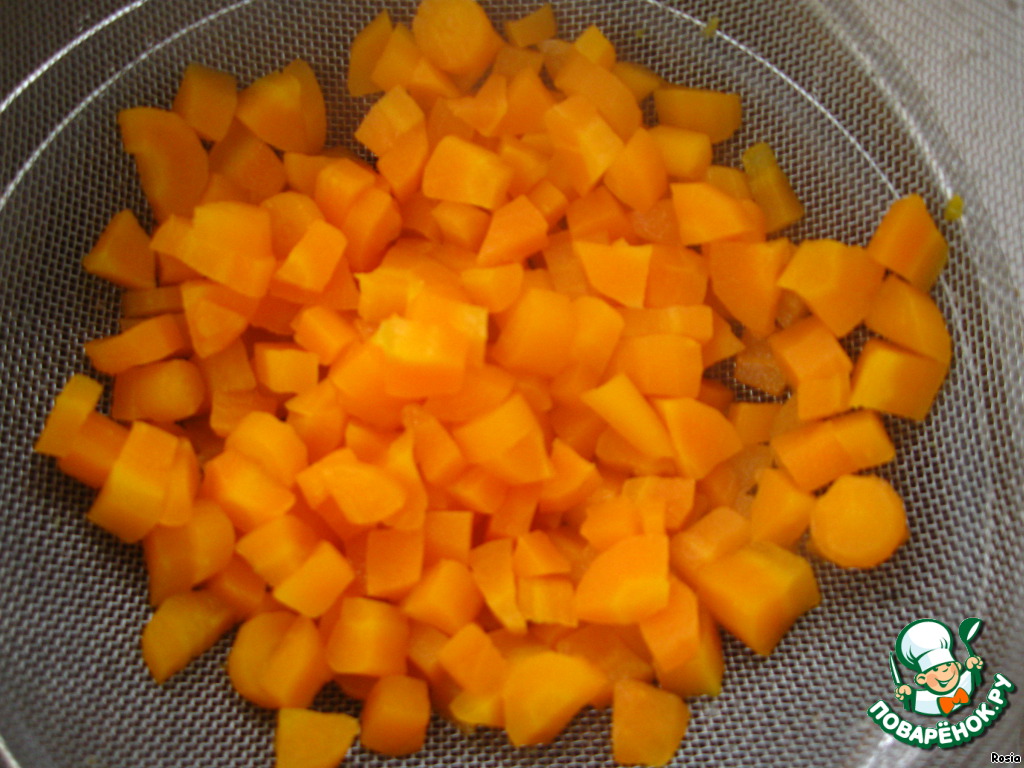 Морковь почистить, нарезать кубиками. Сварить. Слить воду.