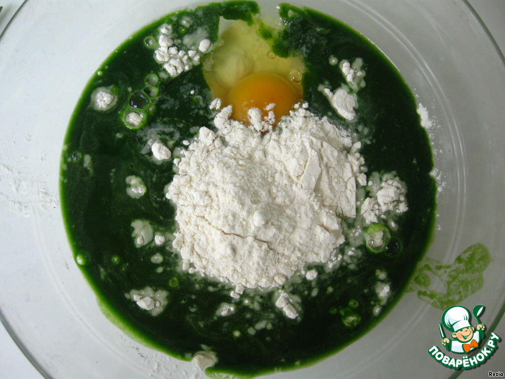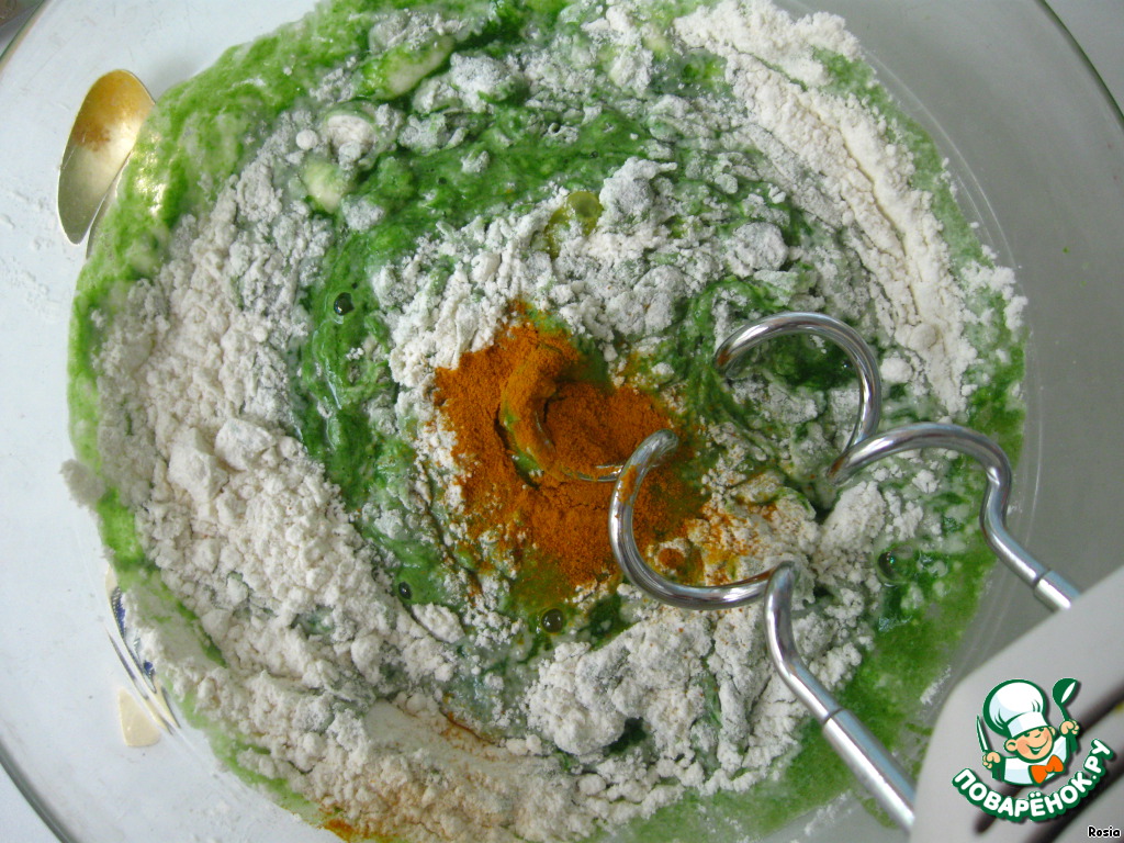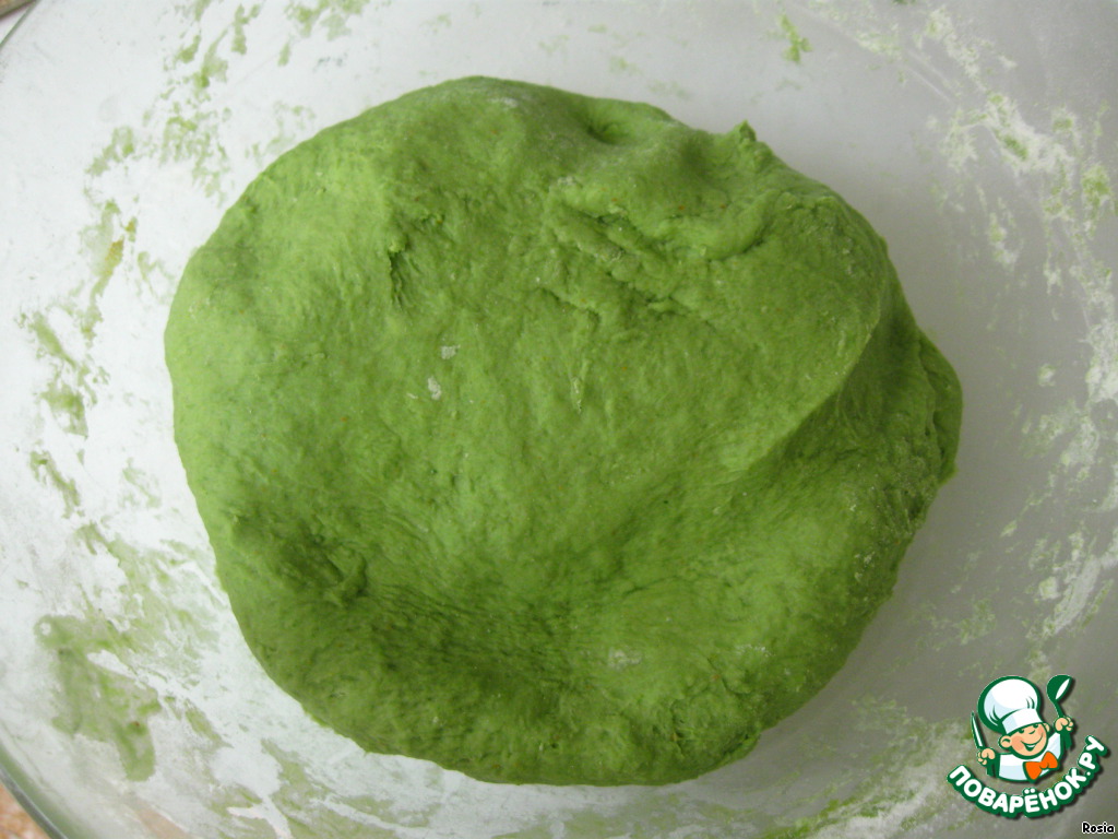 В миску насыпать 350 г муки + 1 яйцо + шпинат + 1 ч.л. оливкового масла + 0,5 ч.л. куркумы. Замесить тесто.