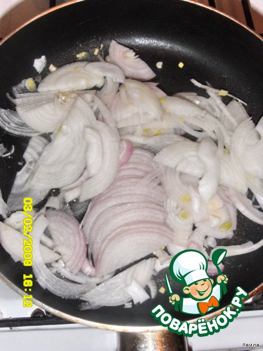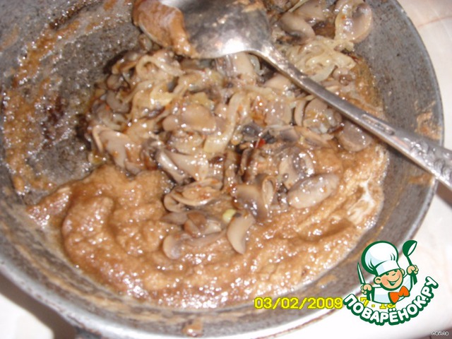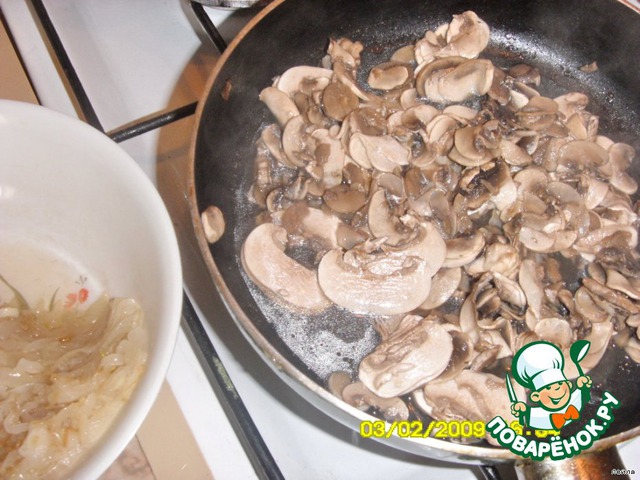 Начинка: Нашинковать грибы и лук. Вначале обжарить лук