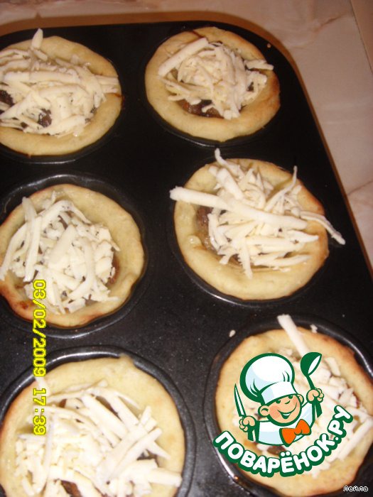 До готовности минут за 5 вытащить, обсыпать тертым сыром и допечь тарталетки.