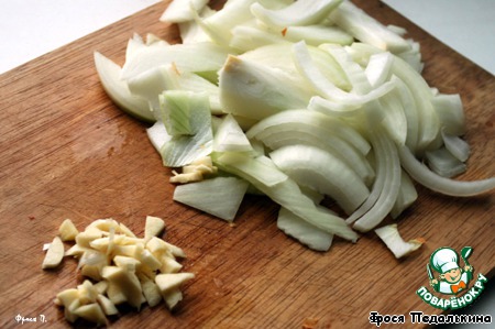 Лук и чеснок очистить. Лук порезать полукольцами, чеснок - мелко.
