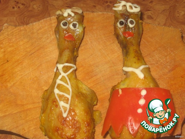 Так как моего мужа не удивишь уже даже карамельной курицей, пришлось превратить ее в "веселых гусей". С помощью майонеза делаем глаза, вставляем зрачки из черного перца, клюв из болгарского и одеваем кто во что горазд. Ну вот, теперь точно все готово! Приятного аппетита!!!