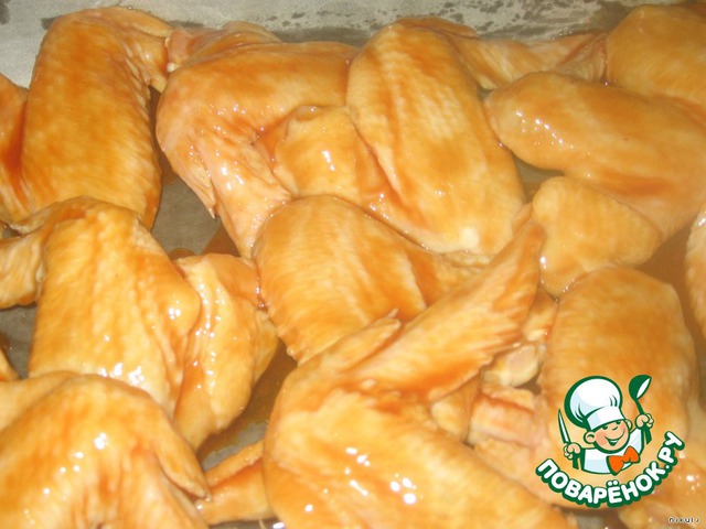 Когда немного остынет смазать этой смесью подготовленные порционные кусочки курицы. Сложить их на противень, смазанный маслом, оставить мариноваться 3-4 часа (можно и на ночь).