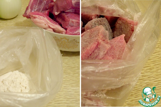 В полиэтиленовый пакет насыпать муку, положить кусочки мяса, завязать мешочек и хорошенько встряхнуть, чтобы мука покрыла каждый мясной кусочек.
