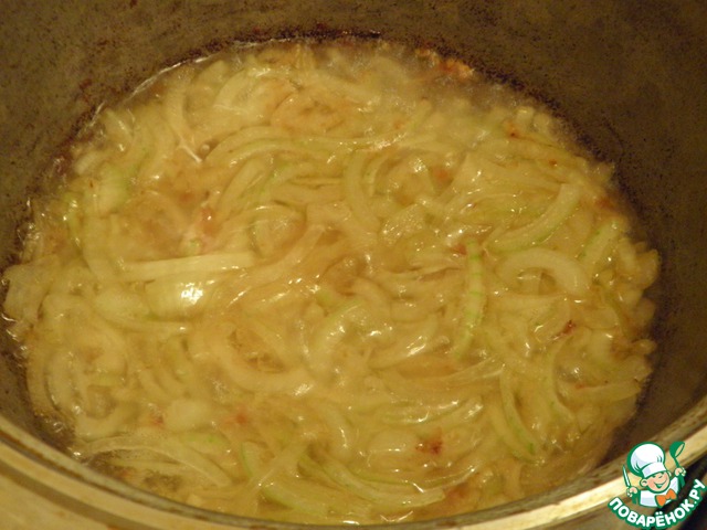 Лук нарезать четверть-кольцами. Обжарить до золотистого цвета и полупрозрачности.