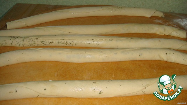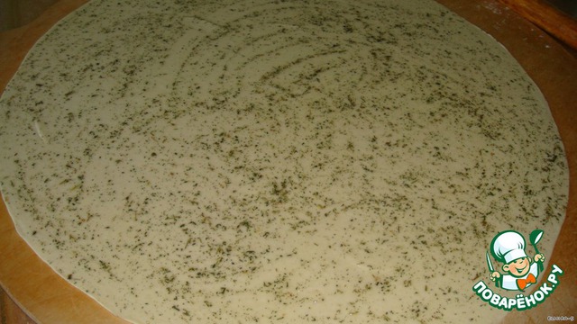 Раскатайте в пласты, посыпьте сверху немного соли и травку миркимура,
