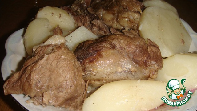 Каждый берёт себе хинкал, мясо и картошку - столько, сколько хочет, поливая соусом, ест.