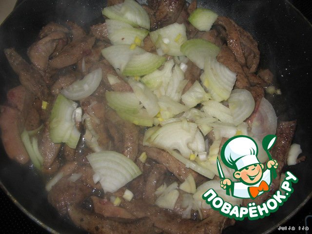 Печень нарезать также соломкой. Обжарить на растительном масле 2 минуты.
