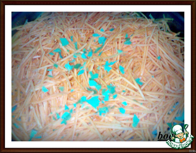 Посыпать раскрошенным лавровым листом и, не перемешивая, накрыть крышкой.