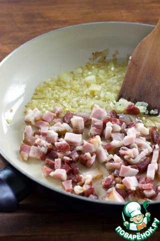 Пока отваривается паста, займемся соусом. Нарежем небольшими кубиками ветчину (у меня кусочек копченого бекона) и небольшую луковицу.