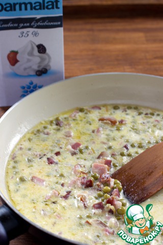 Ставим огонь на минимум, добавляем горошек и, деликатно помешивая, готовим еще минут 5.