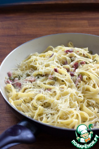 К этому времени уже сварилась паста, откидываем ее на дуршлаг и добавляем к соусу. Прогреваем все вместе, осторожно помешивая, еще пару минут, посыпаем пармезаном и раскладываем по тарелкам.