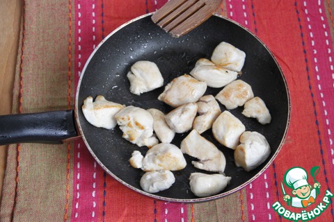 Куриные грудки помыть, промокнуть от влаги, нарезать крупными кубиками 3*3 см.