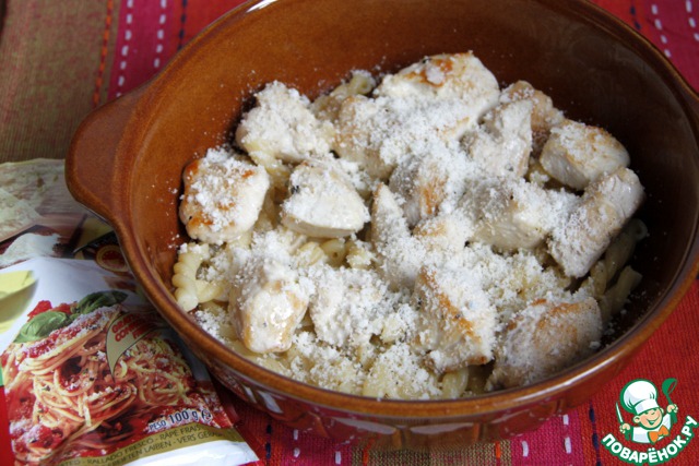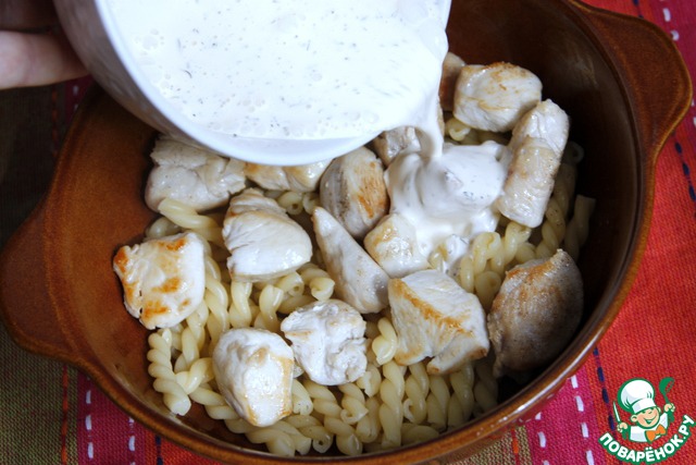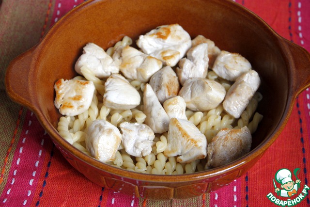 Форму для запекания смазать маслом, выложить на дно макаронные изделия, сверху - обжаренные кусочки мяса.