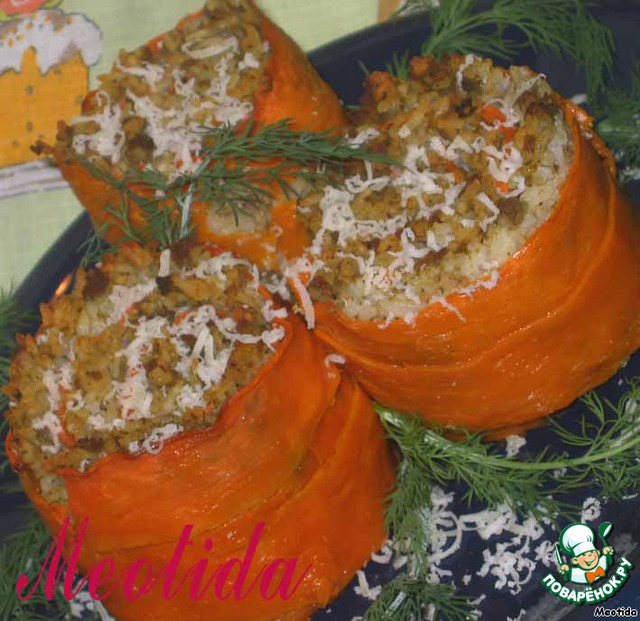 тыкву посыпаем солью и перцем, сверху выкладываем слой фарша с рисом