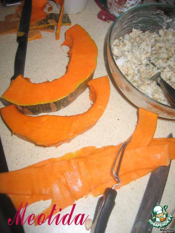 тыкву ножом для чистки овощей нарезаем на тоненькие полосочки
