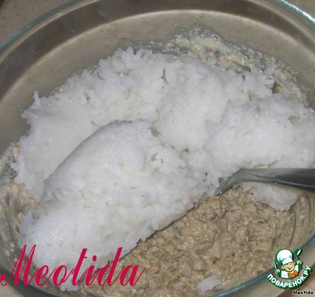 смешиваем рис с фаршем, приправляем солью и перцем по вкусу