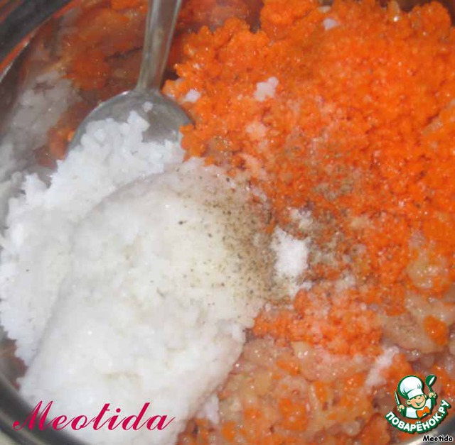 пропускаем через мясорубку тыкву, курицу, лук и чеснок, добавляем в фарш рис, соль и перец, все перемешиваем