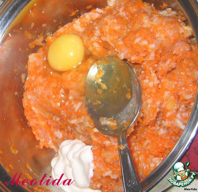 теперь добавляем яйцо и сметанку и мешаем до однородности, получаем нежнейший фарш