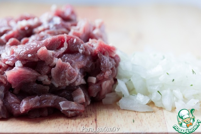 2. Вот в чем я допустила вольность, так это в выборе мяса. В аутентичном рецепте идет баранина пополам с курдючным жиром. Но у нас отношение к баранине неоднозначное, найти хорошую баранину очень сложно и выбирать я ее абсолютно не умею. Поэтому я заменила ее говядиной с жирком. Мясо нужно нарезать мелко-мелко, почти как на фарш. Лучше резать чуть подмороженное мясо. Правда, после приготовления я увидела, что можно было порезать мясо еще мельче. Лук почистить и тоже мелко порезать.